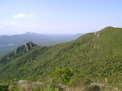 Em aproximadamente 45 minutos cheguei ao ponto mais alto do morro. Logo na chegada avistei dois grupos curtindo a vista, que estava maravilhosa. Um céu azul e os morros ao redor todos a vista podendo enxergar até mesmo parte do litoral. Os grupos eram formados por 1 rapaz e 2 meninas cada e estavam distantes um do outro e, como não conhecia ninguém, achei meu cantinho pra ficar ali sentado e sentir o ar puro da serra.