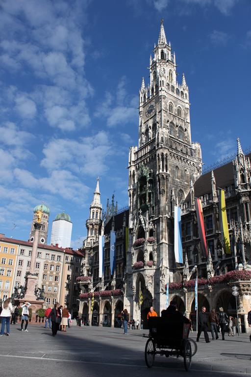 Lendas a parte, o passeio segue a pé até o coração de Munique, a Marienplatz, local onde fica o belo prédio da prefeitura (Rathaus). Uma boa dica para curtir ainda mais o visual da praça é subir até o quinto andar do edifício, chamado Glockenspiel, e tomar um café apreciando a vista panorâmica. A torre da igreja St. Peter’s Church (Alter Peter) também é uma boa opção para ver a Marienplatz do alto.