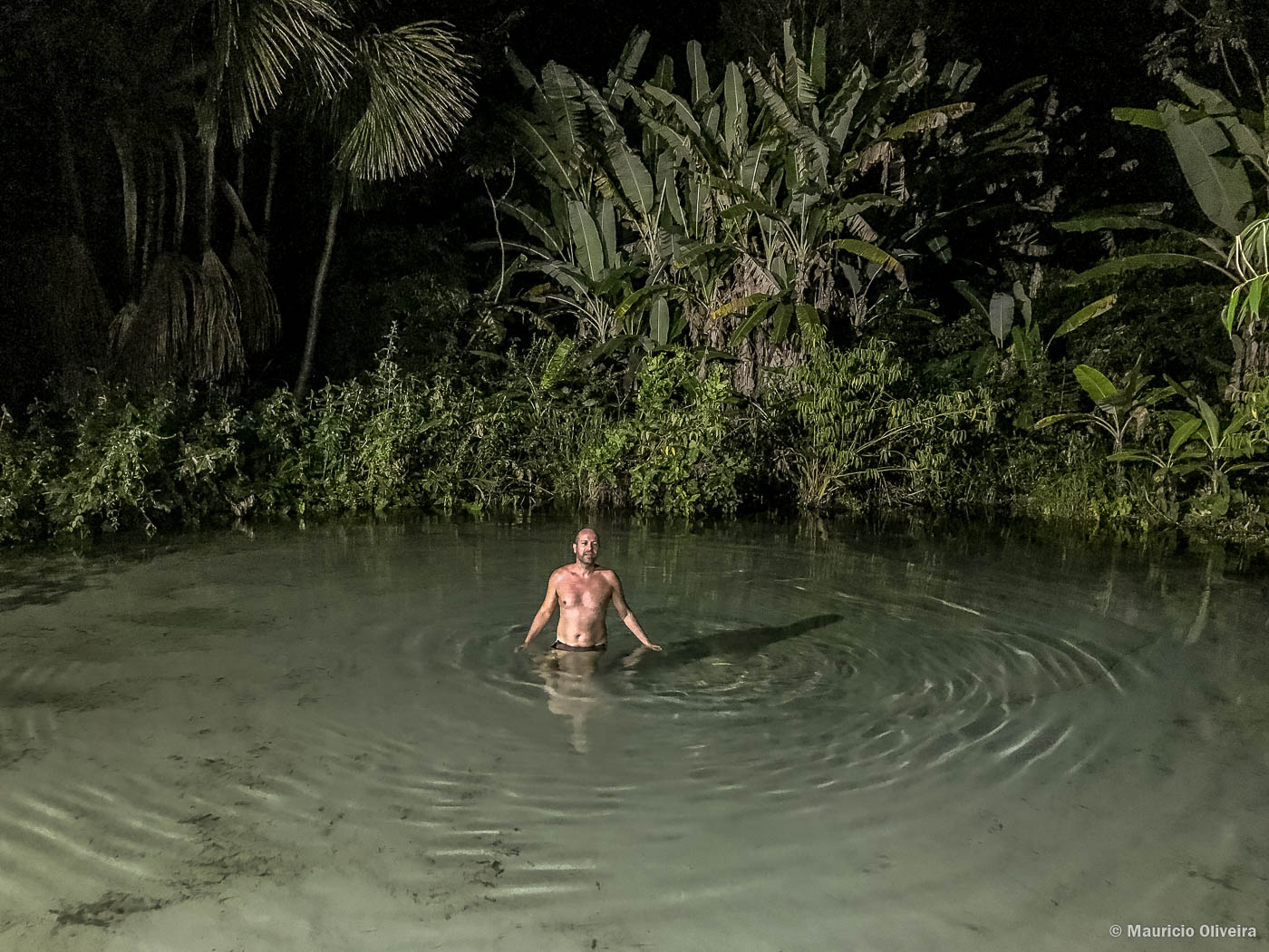 O próximo foi o Fervedouro Encontro das Águas, pequeno, porém potente. É impossível afundar nele. Logo ao lado tem o encontro dos rios Formiga e Sono. Um amarelado e frio, e o outro azulado e morno. Vale a pena dar um mergulho e sentir a temperatura da água mudar. O lugar é lindo.