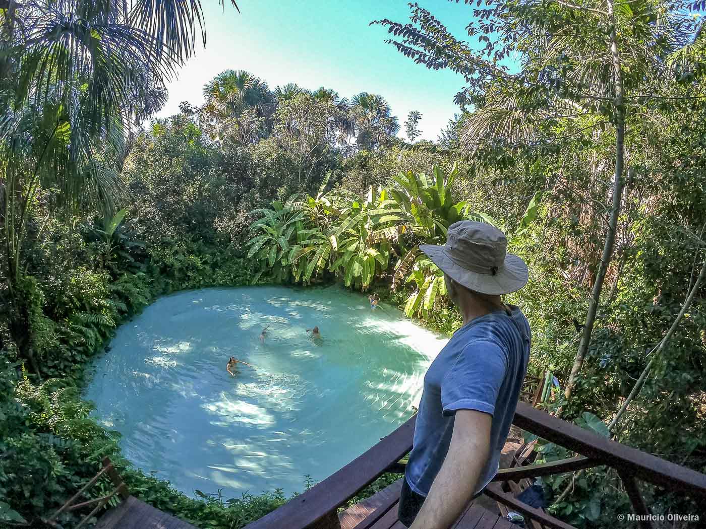 De lá seguimos para o Fervedouro das Macaúbas, que tem uma peculiaridade. Ao pisar nas areias das bordas, o pé vai afundando e temos a sensação de pequenos choques. É bem legal. O deck de frente ao fervedouro oferece oportunidade para lindas fotos. Aproveitem.