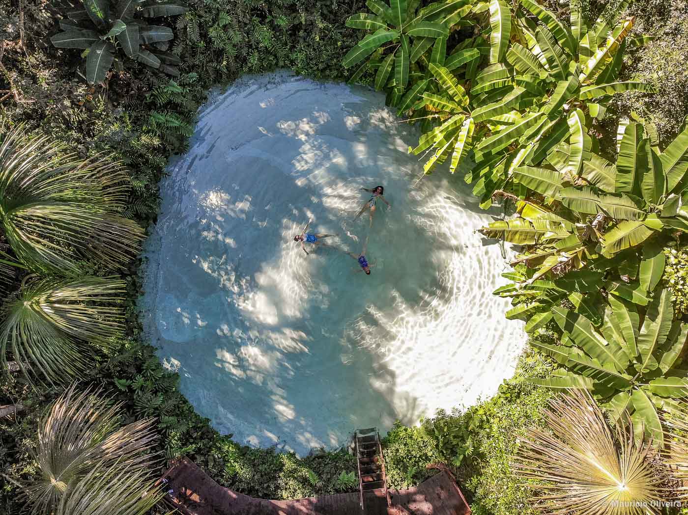 O próximo foi o Fervedouro Encontro das Águas, pequeno, porém potente. É impossível afundar nele. Logo ao lado tem o encontro dos rios Formiga e Sono. Um amarelado e frio, e o outro azulado e morno. Vale a pena dar um mergulho e sentir a temperatura da água mudar. O lugar é lindo.