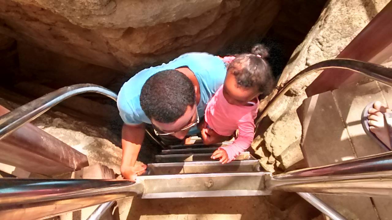 Foram feitas melhorias na escada, mas o trecho de fato é sem espaço. Como a Manu já está com 11kg, não cabe mais no canguru. O que fizemos no dia do Sancho foi concentrar as coisas na mochila (inclusive alimento para o almoço - muita fruta, suco e água) e não levamos guarda-sol no dia (o único dia, por sinal). Aí eu desci com a mochila e o meu esposo com a Manu. A escada nova se parece muito com as escadas de escorregador que as crianças sobem, então tem pontos que com supervisão ela até subiu sozinha (no retorno). Quando chegamos tinha também um funcionário do Parque, que agilizou para não ter ninguém subindo quando estivéssemos descendo. As trilhas dos Dois irmãos e dos Golfinhos fizemos com ela andando...está toda "urbanizada e acessível".