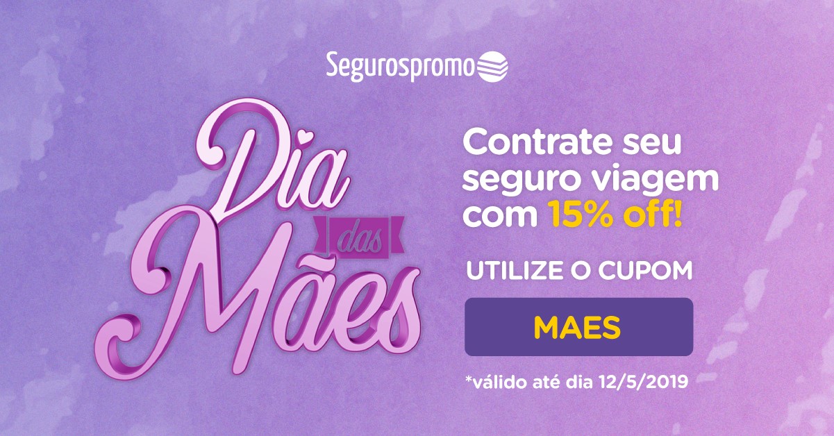 Nossa Promoção de Dia das Mães já está valendo! A partir de hoje até o dia 12/05, todos os nossos planos estarão com 15% de desconto. Ah! E optando por pagar via boleto bancário, você ainda ganha mais +5% OFF. O seguro viagem pode sair com 20% de desconto! Todos os planos de seguros viagem estarão desconto utilizando o cupom MAES.