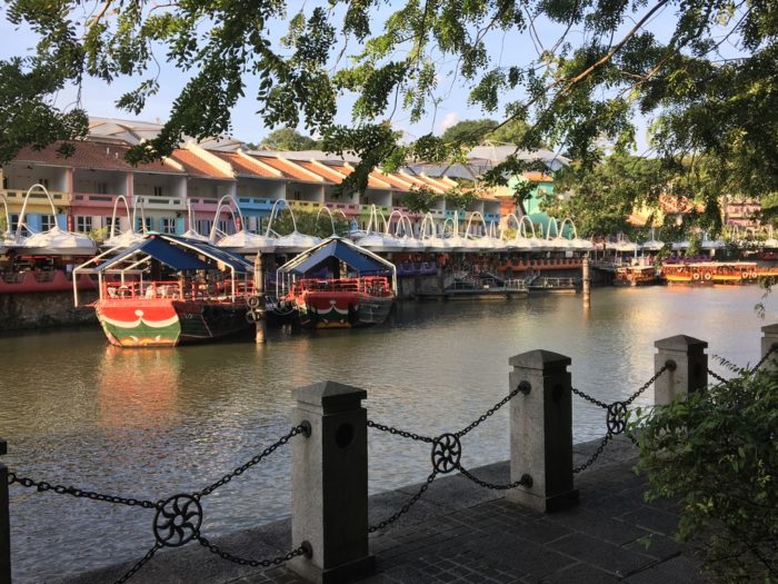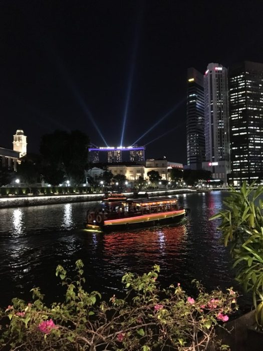 Ao chegar em Clarke Quay fomos atrás de informações sobre o passeio de barco local, mas desistimos por perceber que praticamente ninguém fazia, não era muito animado e também pelo custo benefício – 20 minutos por aproximados 40 dólares. Assim, optamos por beber e caminhar por ambos os distritos, escolhendo um restaurante super gostoso em Boat Quay, onde experimentamos pela primeira vez o incrível prato tailandês de arroz frito no abacaxi (com uma vista linda da baía e ao fundo o Marina Bay Sands) e o drink Singapore Sling, que é uma delícia.