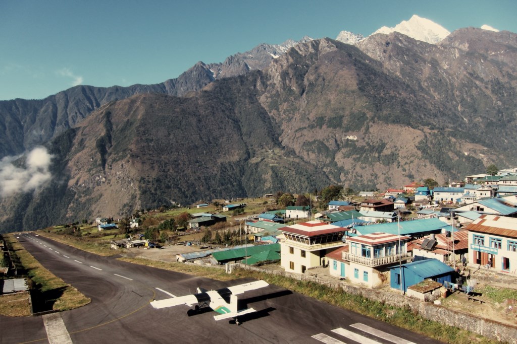 Pegamos um aviãozinho turboélice com lugar para dez passageiros. O pouso foi em Lukla, na pista de aterrissagem mais perigosa do mundo, segundo o Discovery Channel. Além dos ventos muito fortes e imprevisíveis, a pista é curta, super inclinada e delimitada por precipícios. Já aconteceu algumas vezes do avião cair nos despenhadeiros, ou mesmo capotar na pista, matando todos a bordo. Que aventura! Mas, pelo menos, começamos a caminhada a partir de 2.840m de altitude. Os exploradores do passado tinham que sair de Katmandu, com seus 1.400m.