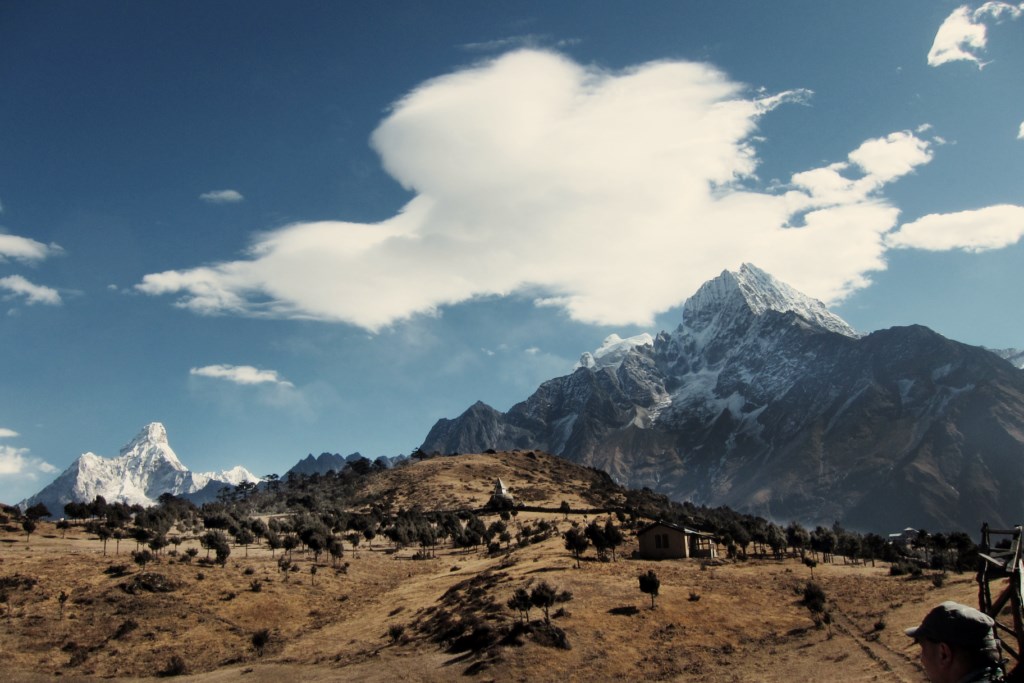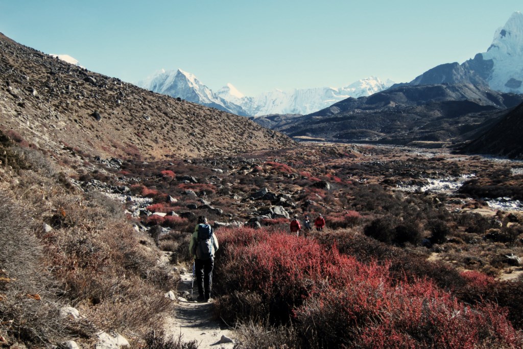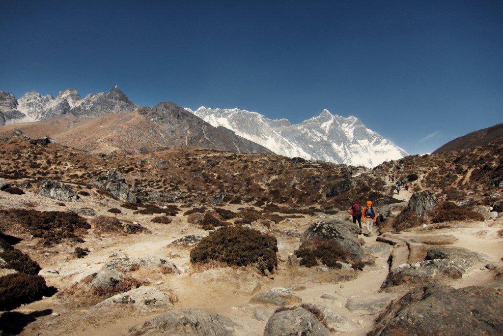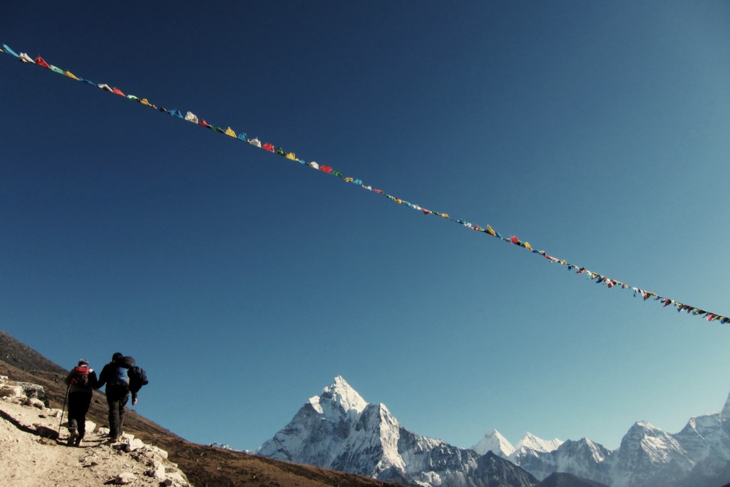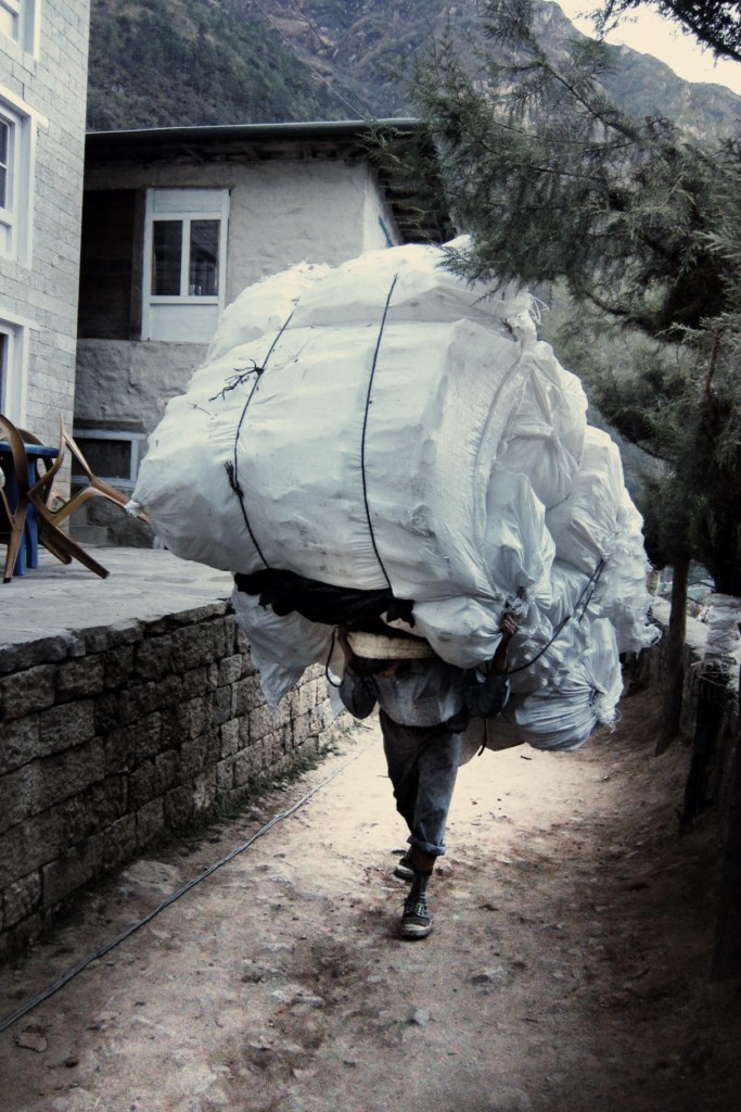 A região é ligeiramente povoada. Em construções muito simples vivem os sherpas, povo de origem tibetana, budista, superadaptado ao ar rarefeito do Himalaia. Enquanto nós penávamos, já no começo, com a falta de oxigênio e o esforço físico nas trilhas longas e íngremes, os sherpas carregavam nas costas pesos absurdos, cantando e assobiando durante a caminhada. Eram eles que levavam nossas malas e preparavam as refeições. Acostumados com os brasileiros que se aventuram no Nepal, eles falavam algumas palavras em português. “Bóra, bóra! Cabô moleza!”, era o que mais ouvíamos quando estávamos jogados no chão, exaustos, tentando recuperar o fôlego. Realmente não havia tempo para descansar. Em geral, começávamos a caminhar no nascer do sol e só parávamos quando ele estava atrás da cordilheira.
