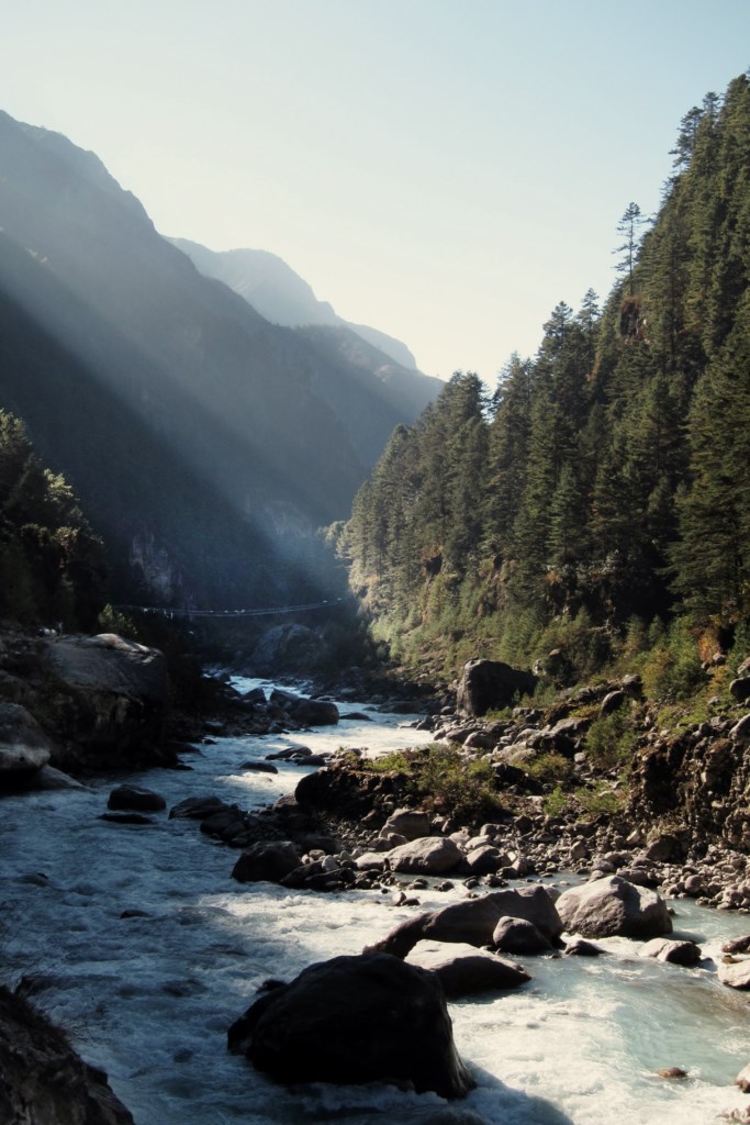 No início, a trilha acompanhava um rio cercado por um bosque típico do filme Senhor dos Anéis. O rio ficava cada vez mais para baixo. Nós o atravessamos diversas vezes em pontes longas e estreitas, centenas de metros acima da água. Muitas delas eram feitas de madeira já em decomposição, o que deixava tudo mais perigoso. Para completar, rebanhos de yak (espécie de boi peludo que só existe na região) também passavam por lá. Às vezes, quando estávamos no meio da travessia, eles entravam no lado oposto da ponte. Não havia como passar por eles. Então voltávamos correndo e gritando “Yak attack!”, para que os retardatários também dessem meia volta. Depois fiquei sabendo que alguns turistas morreram sendo empurrados da trilha e perfurados pelos chifres dos yaks. Quando estávamos subindo, a orientação era ficar do lado de dentro da trilha, nunca do lado do precipício.