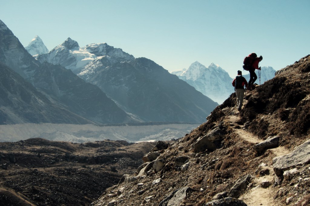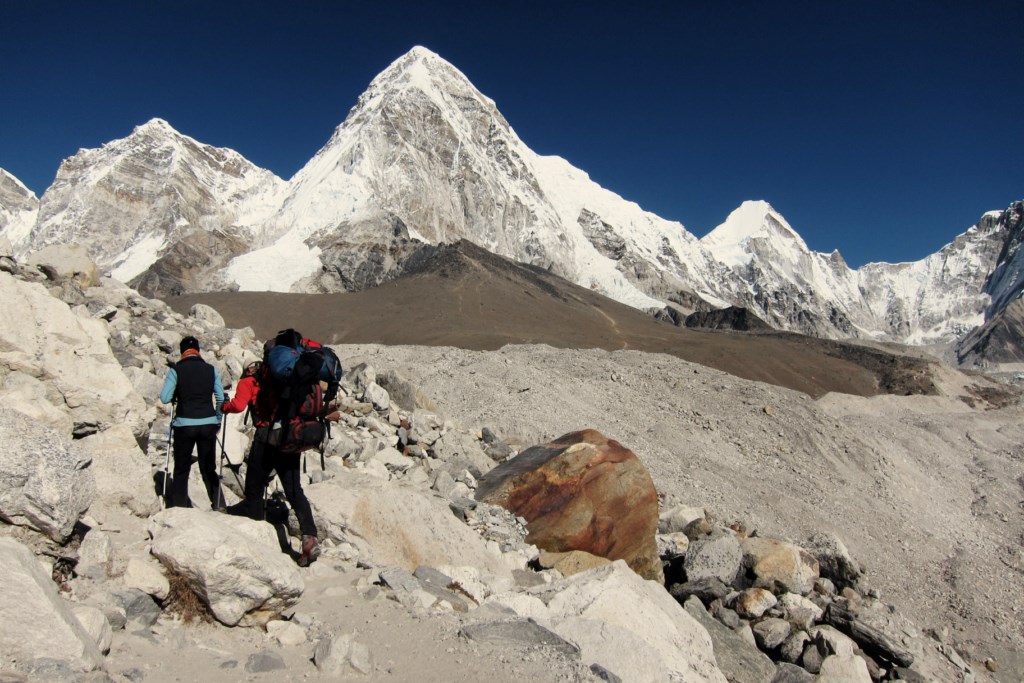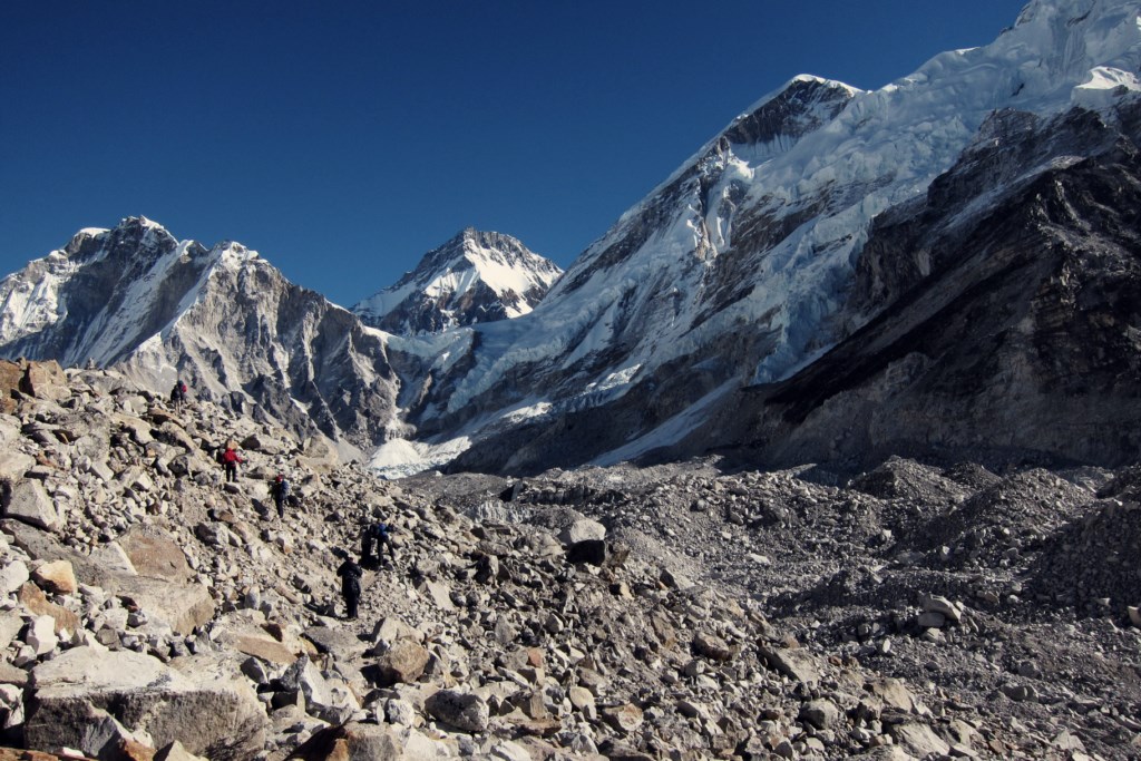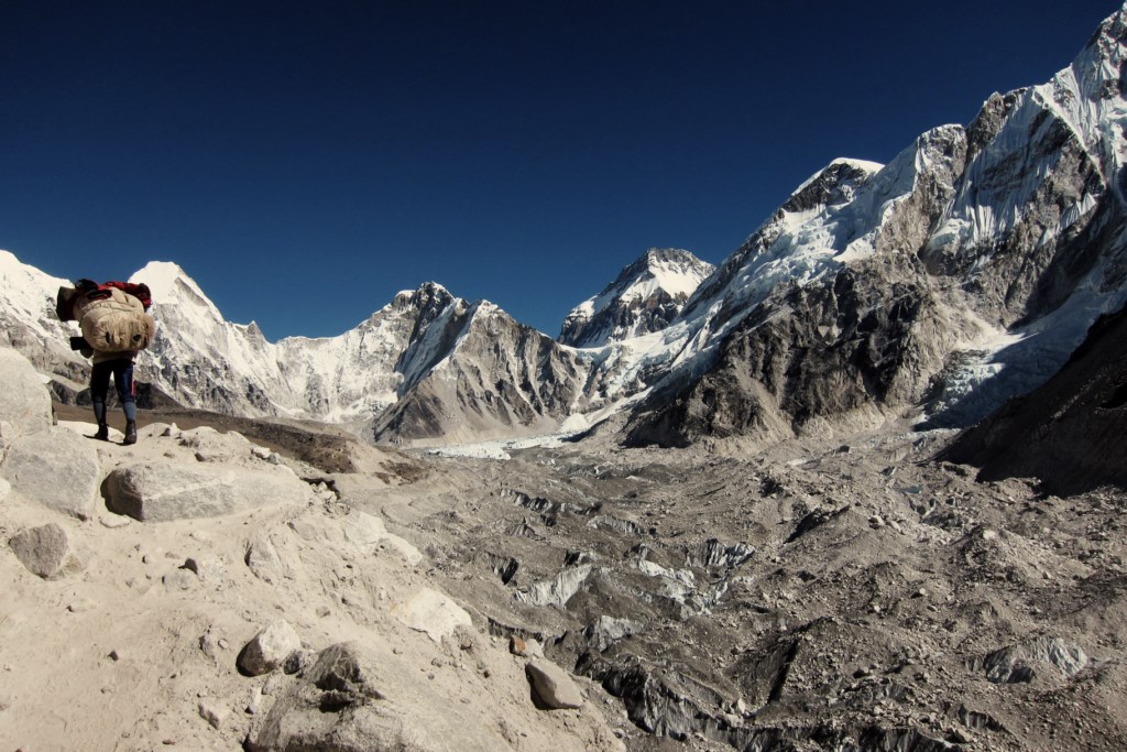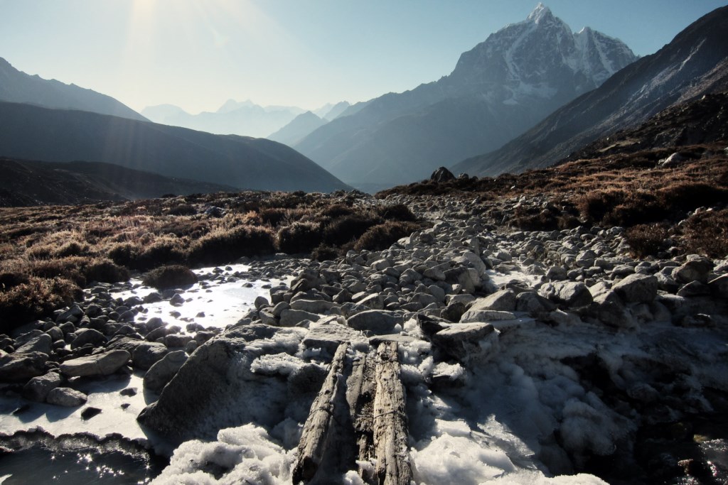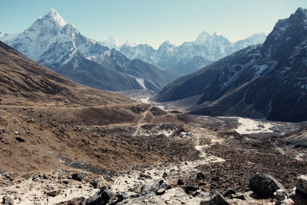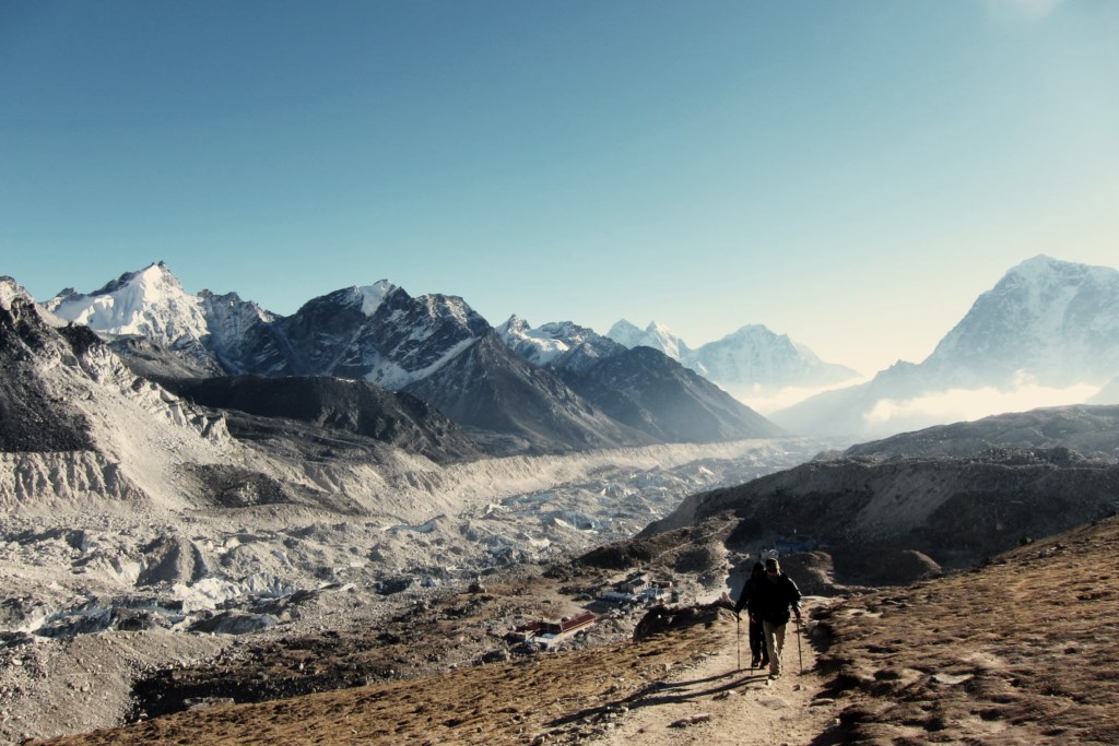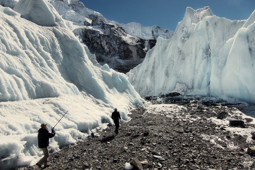 Com o passar dos dias a paisagem foi se alterando. As árvores ficaram mais raras e menores, até sumirem de vez. O terreno ficou seco. A temperatura caiu drasticamente. Em uma noite, chegamos a pegar -20ºC, mas a sensação térmica era menor ainda, por conta dos ventos. O cenário era de pedras e geleiras, com montanhas brancas tocando o céu azul sobre nós. A falta de oxigênio nos deixava tontos, enjoados, com dor de cabeça severa. Ficávamos muito ofegantes. Os passos eram curtos demais. Comecei a achar que poderia não conseguir. Quando estávamos praticamente em 5.000m de altitude, um dos integrantes da expedição escorregou e quebrou o pé em três partes. Quatro sherpas abandonaram suas cargas e o carregaram morro abaixo, até um lugar onde poderia chegar o helicóptero de resgate. Mesmo sendo um helicóptero especial, feito para conseguir sustentação no ar rarefeito, o vento estava forte e não havia como pousar naquele momento. Felizmente, algumas horas depois as condições climáticas melhoraram e ele pôde ser levado para a sala de cirurgia em Katmandu.