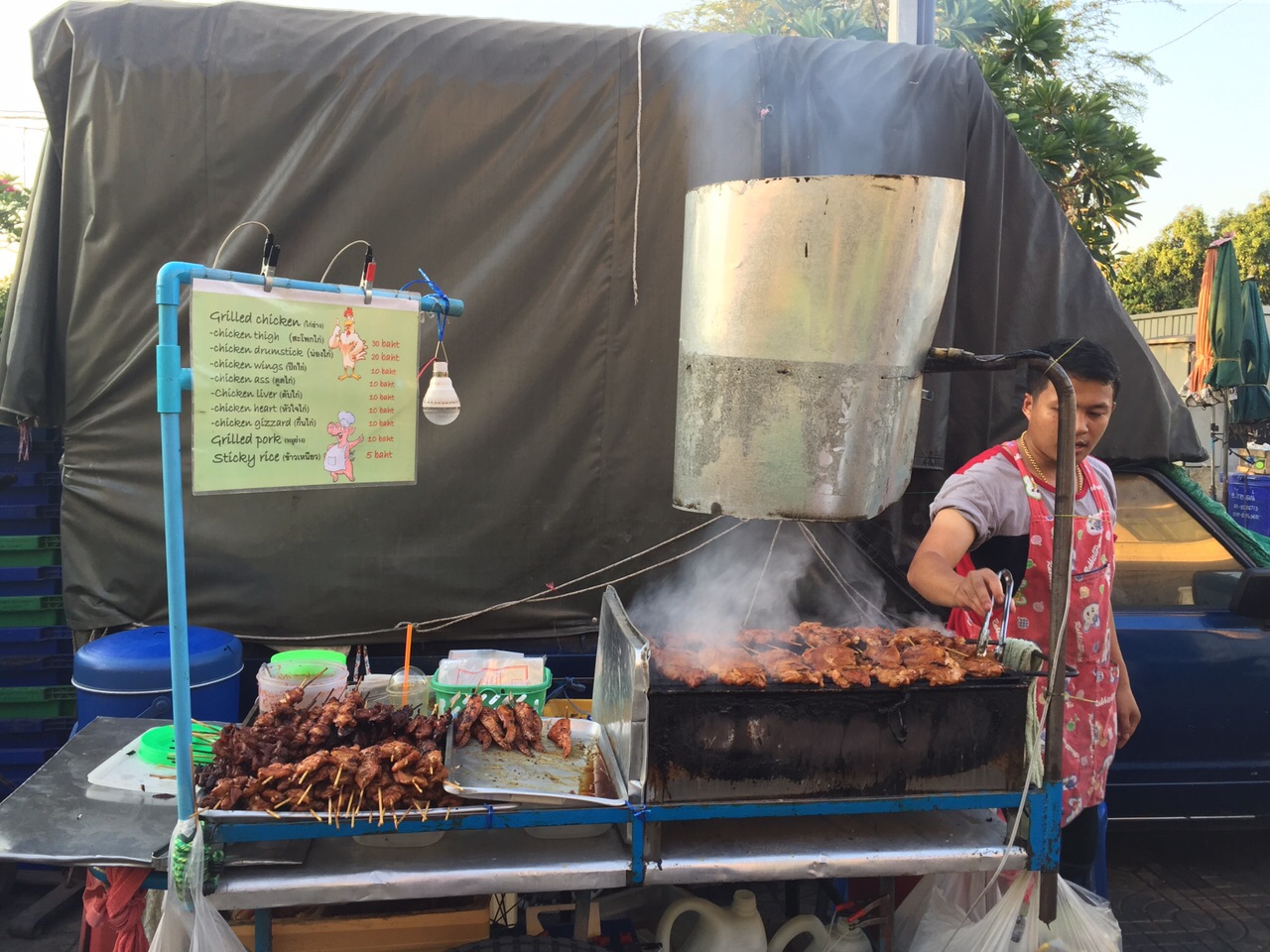 Por toda a Tailândia, é bem comum nas ruas a exposição de barraquinhas ofertando todo tipo de iguaria. Ao primeiro momento, fica-se receoso por conta das condições higiênicas, e este foi o meu caso. Experimentei em apenas duas barraquinhas: em uma provei espeto de carne de porco (exigi que a carne fosse bem assada, quase tostada) e em outra uma espécie de canja de galinha (deliciosa, por sinal, bem apimentada).