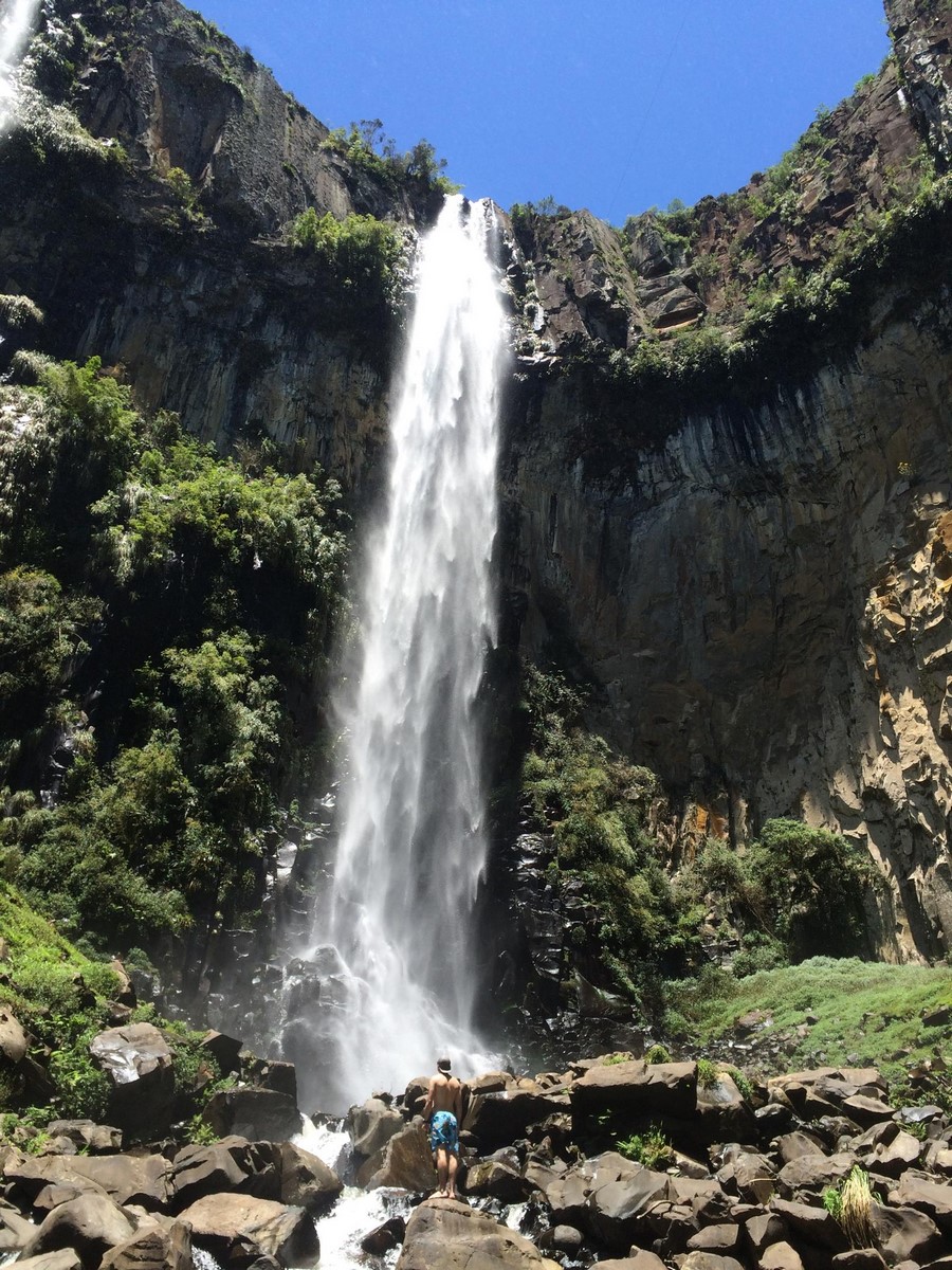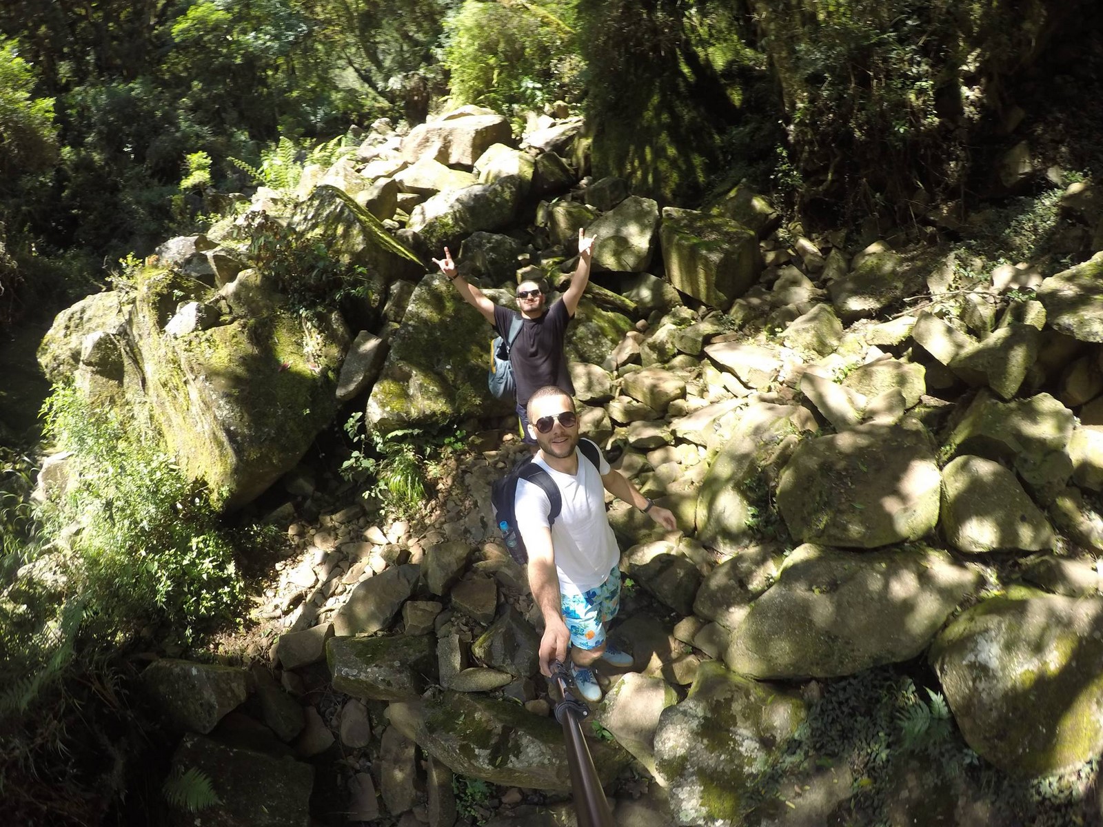Após isso é necessário fazer um trilha de no máximo 15 min até chegar no pé da cascata. O caminho é com muitas pedras grandes e escorregadias. É interessante estar de tênis e tomar bastante cuidado, pois nesse percurso existem muitas aranhas.