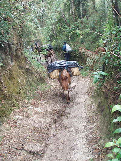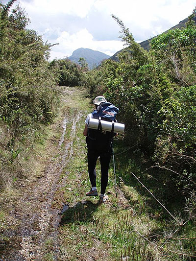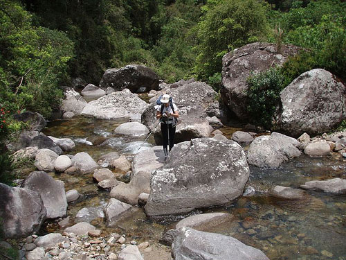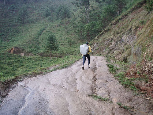 A parte mais emocionante começou na segunda metade da trilha (agora posso rir tranqüila, mas na hora, só podia rezar!). Havíamos lido sobre uma tal de SUBIDA DA MISERICÓRDIA. Deus misericordioso! O bicho é feio !! e ainda pra ajudar, vou contar o que aconteceu para apimentar a aventura. Estávamos a cerca de 1 km da tal subida, andando por matinhas, riozinhos, avistando paisagens e afins e de repente, começa um pé d’água. Uma baita chuva que em poucos minutos molhou até a alma e nossas roupas dentro da mochila (embora tivéssemos colocado capas nas mochilas, descobrindo naquele momento que elas não protegem totalmente, portanto, é prudente colocar suas roupas em sacos plásticos).