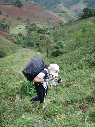 Na verdade, inicialmente não sabíamos que esta era a famosa subida. Paguei todos os meus pecados ali, e acho que eles foram realmente abolidos, pois se fossem imperdoáveis, dali eu não tinha passado! Estava no alto de uma montanha descampada, de lá, via-se um imenso e lindo vale, e também, ouvia tenebrosos trovões e horripilantes raios na montanha vizinha. Nem deu pra curtir muito a paisagem, era preciso sair dali o mais rápido possível, o Renato ia à frente, e eu, lanterninha, atrás, mas estava com meus pulmões bombando! Era o máximo da minha capacidade respiratória! Não foi tanto o esforço físico que estava acabando comigo, o medo com certeza era pior. Ficava pensando se o Renato iria saber fazer massagem cardíaca e respiração boca a boca, caso eu fosse eletrocutada…