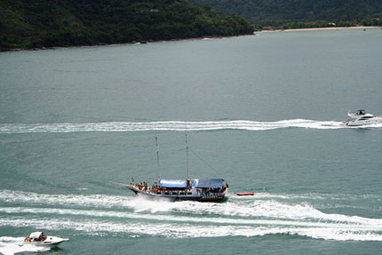 Em um ponto alto do morro, pude avistar a escuna, retornando em uma de suas viagens, lembro-me de ter ouvido que de barco o tempo era de 20 minutos. rsrs. Mas não tem nada melhor do que estar próximo da natureza e sentir aquele aroma, com possibilidade de ver pássaros e alguns animais silvestres.