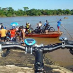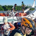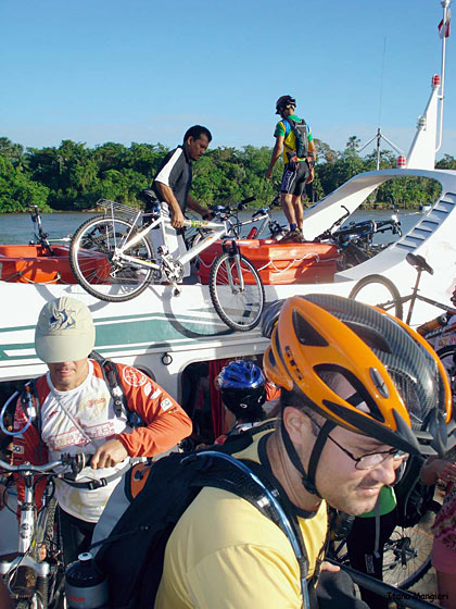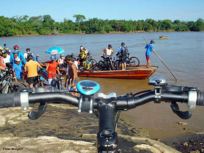 Iniciando a pedalada, seguiram todos pelo asfalto por 2 km até outra travessia no rio por barquinhos chamados de Catraca, por 5 minutos, até a Ilha de Trambioca. Mais ou menos 8 ciclistas em cada Catraca, junto com balanços, desequilíbrios e muitas gargalhadas.