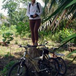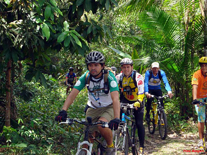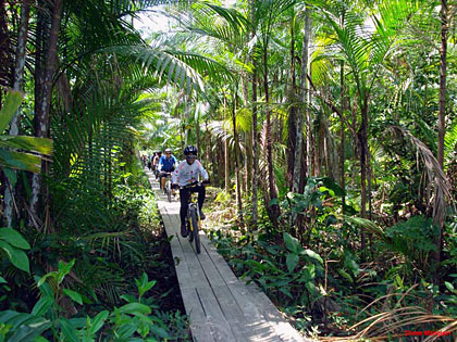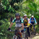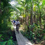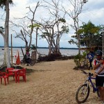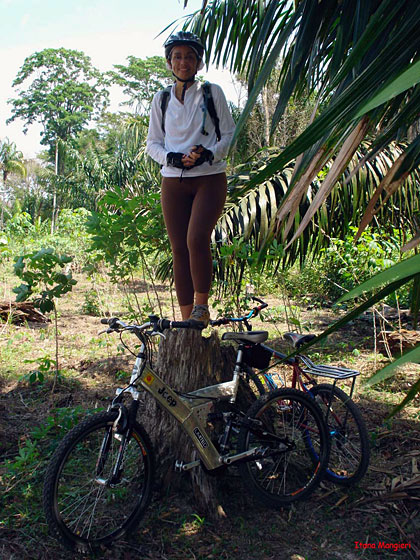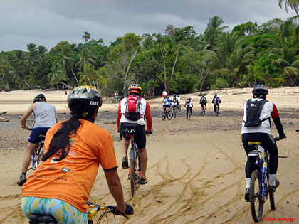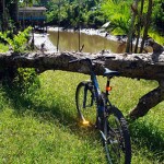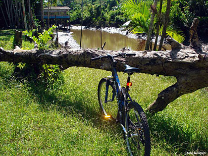 Essa trilha foi quase toda percorrida por single-tracks, mata fechada e estreita (quase nos enroscando nos galhos), cheiro de mato, pássaros, borboletas e durante as paradas para trocas e pneus furados, macacos. Com a maré baixa, trechos secos e pedalados por caminhos de palafitas regados de jambo nas laterais. Impossível deixar de comê-los.