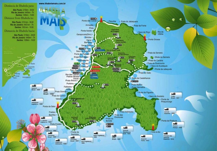 Trilha da Cachoeira do Gato – Quem chegou a Castelhanos, de jipe ou de barco, e deseja aprofundar ainda mais o contato com a natureza, deve mergulhar na Mata Atlântica e encarar os 25 minutos de caminhada até a cachoeira do Gato. Ficar sob a maior cachoeira da Ilha, que despenca de um paredão rochoso de 80 m de altura, é uma experiência inesquecível. O percurso começa no canto esquerdo da praia de Castelhanos. A mata é bem fechada e a trilha, de pequena inclinação. Aos poucos a inclinação vai se acentuando, e a mata fica cada vez mais úmida, cada vez mais cerrada. Não se vê céu aberto até chegar às pedras por onde passa a queda d’água, 25 minutos depois de começar a caminhada. É aconselhável estar acompanhado de um guia que conheça bem a região.