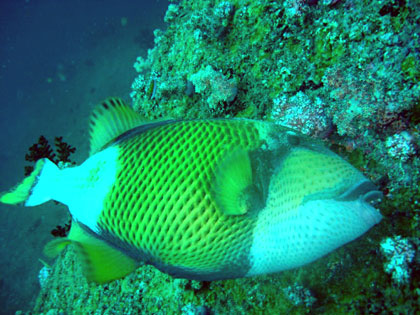 Eu inocentemente fui fotografar o danado. Tinha feito isso varias vezes no dia anterior, sem saber que era uma especie agressiva. Estávamos em pleno mergulho quando eu olhei pra tras e vi o suposto inimigo tomar distancia e atacar as nadadeiras do meu parceiro. Ele era grande. E tinha dentões de fazer estrago. Fui tentar espantar o cretino e logo ele veio pra cima de mim. Era bem assim mesmo, tomava distancia e vinha pra cima com tudo! Depois de quatro tentativas de ataque em que eu me defendi com a câmera e com a nadadeira ele decidiu ir embora. Nos dias seguintes eu passei bem longe dele.