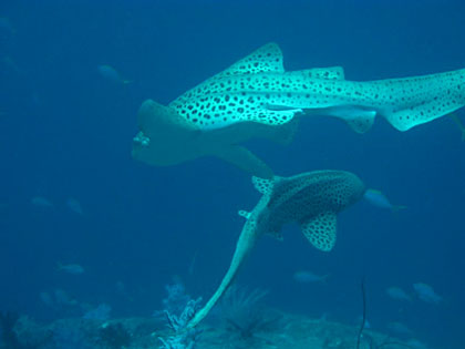 Vimos também muitas Moréias, em todos os mergulhos (em um único ninho, 3 filhotinhos juntos, lindo!), tartarugas, lulas gigantes (50cm! pré-histórica?!), muitos peixe-leão, Barracudas, o Nemo claro entre as anêmonas, e o Tubarão Leopardo que é uma espécie bem dócil.