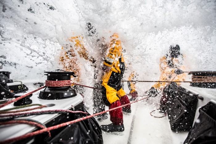 As últimas horas da quinta etapa da Volvo Ocean Race foram bem complicadas e perigosas para os atletas que navegam rumo ao Brasil. Passando pelo Oceano Antártico, as equipes foram obrigadas a fazer manobras e trocas de vela arriscadas na alta velocidade do vento de popa. Os veleiros ficaram literalmente colados na água. Apesar da complexidade dos movimentos, nenhum velejador saiu ferido. O brasileiro Andre ‘Bochecha’ Fonseca, integrante do MAPFRE, participou das manobras. Clique aqui para ver como é um jibe chinês.